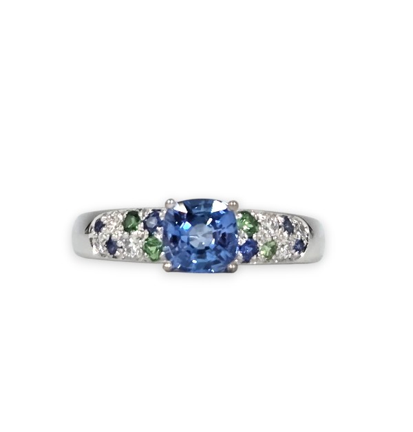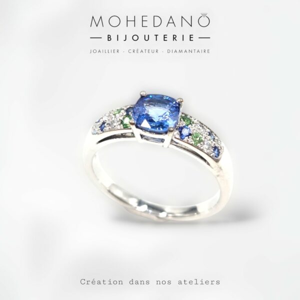 Création Bague Pavage Saphirs, diamants et tsavorites