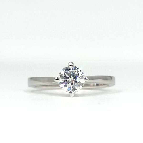 Pièce unique confectionnée à partir d’un très beau diamant rond taille brillant de 0,60 ct. L’originalité du modèle réside dans l’orientation des 4 griffes selon les points cardinaux Nord-Sud / Est-Ouest.