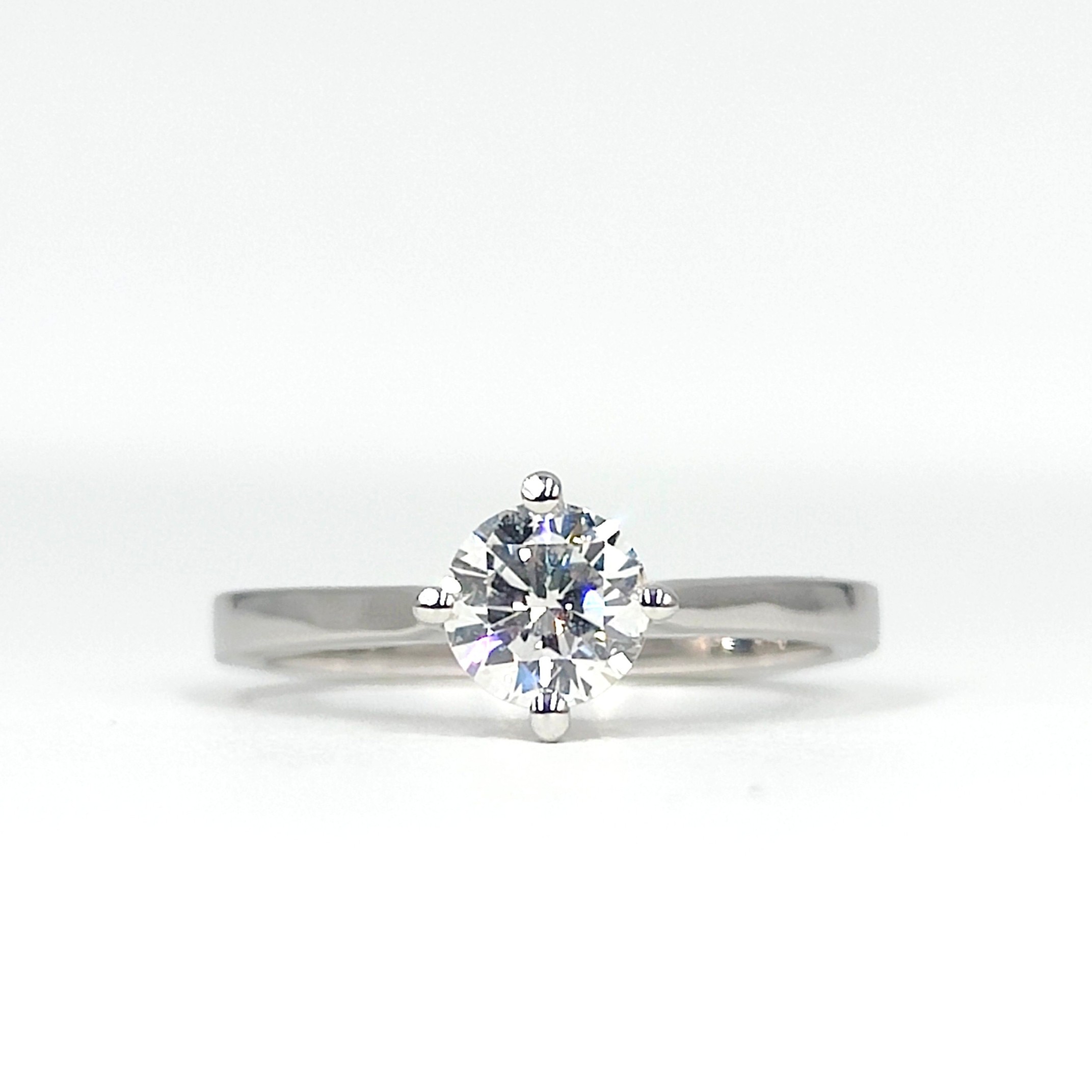 Pièce unique confectionnée à partir d’un très beau diamant rond taille brillant de 0,60 ct. L’originalité du modèle réside dans l’orientation des 4 griffes selon les points cardinaux Nord-Sud / Est-Ouest.